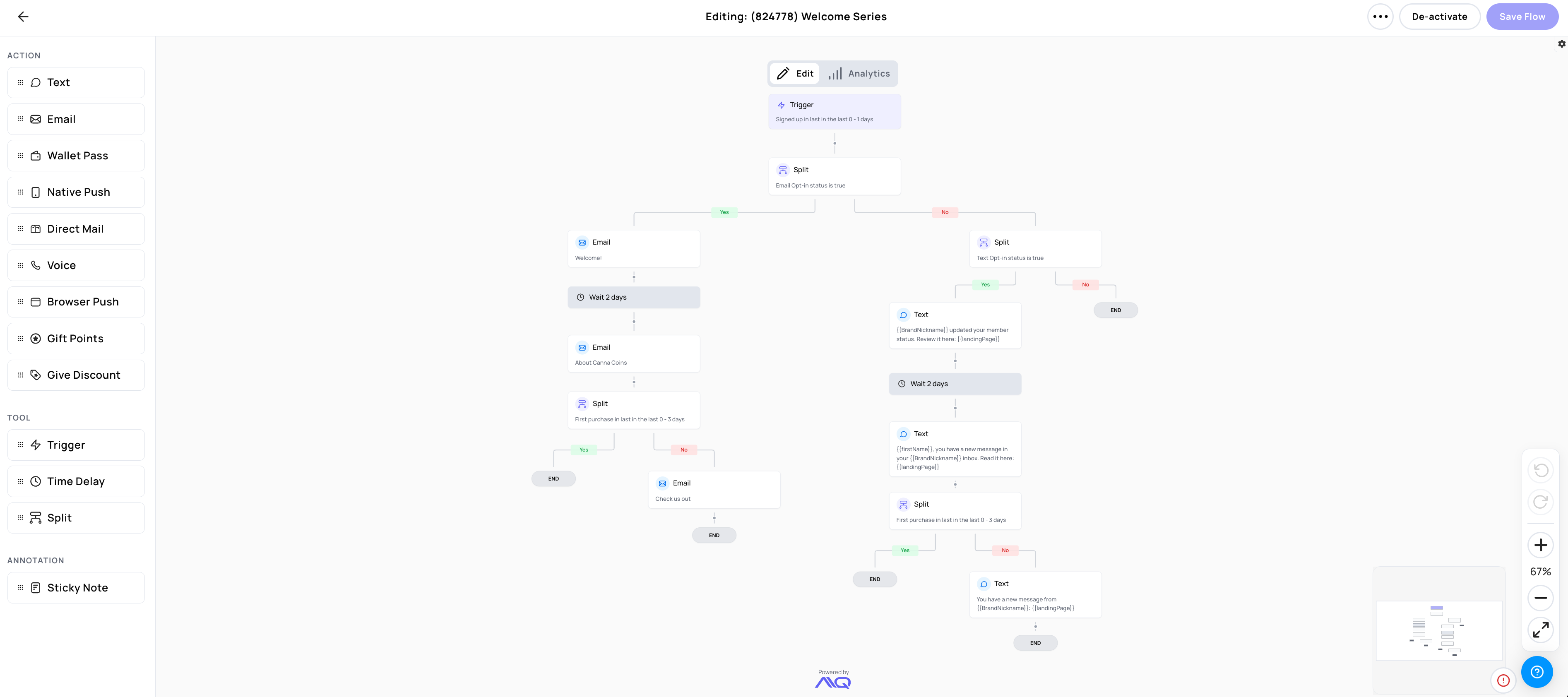 Flows support automation across all AIQ messaging channels (email, SMS, wallet pass, voice drop, browser push, mobile push, and more) all orchestrated within a single journey.